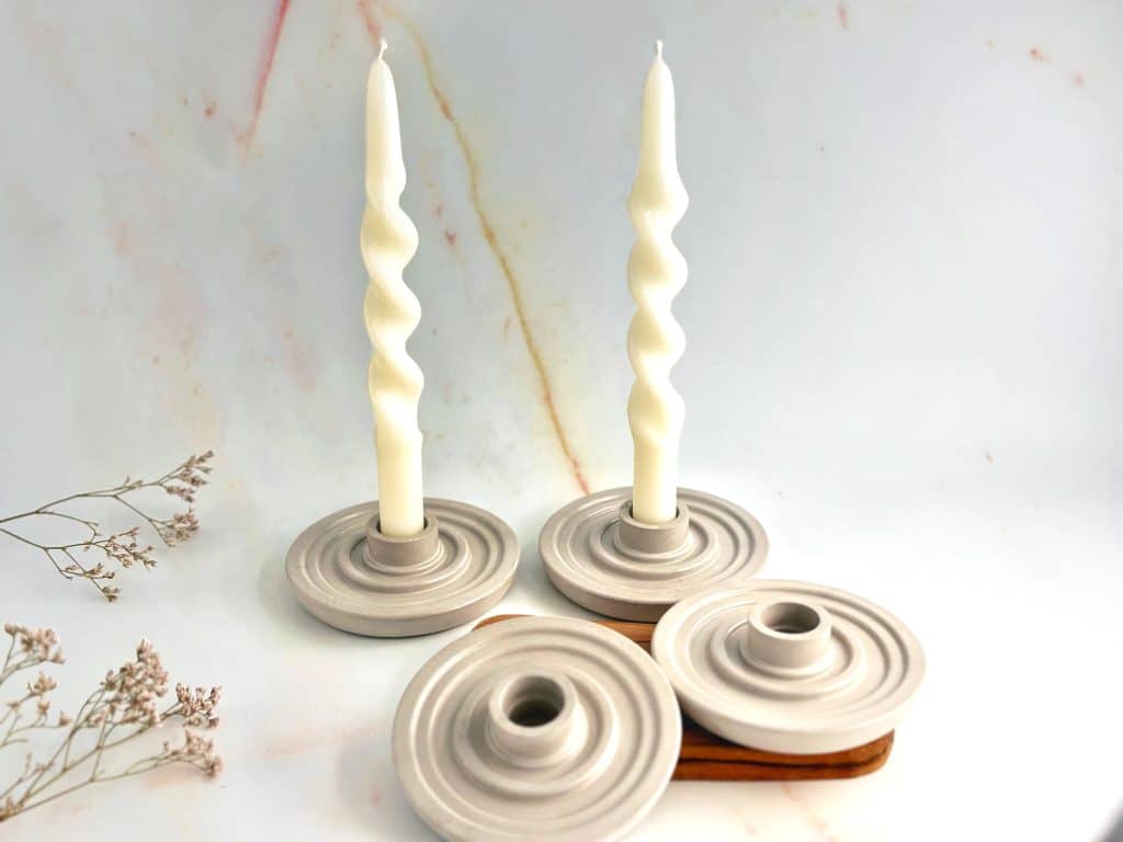 מארז אלכס כולל נר יצוק יעל משעוות דבורים טבעית בגודל 330 גרם, אגרטל עשוי בטון עבור פרחים מיובשים, זוג פמוטים עגולים על מגש עץ אובלי מותאם והכל מוגש על מגש בטון בגודל 25 ש"מ.