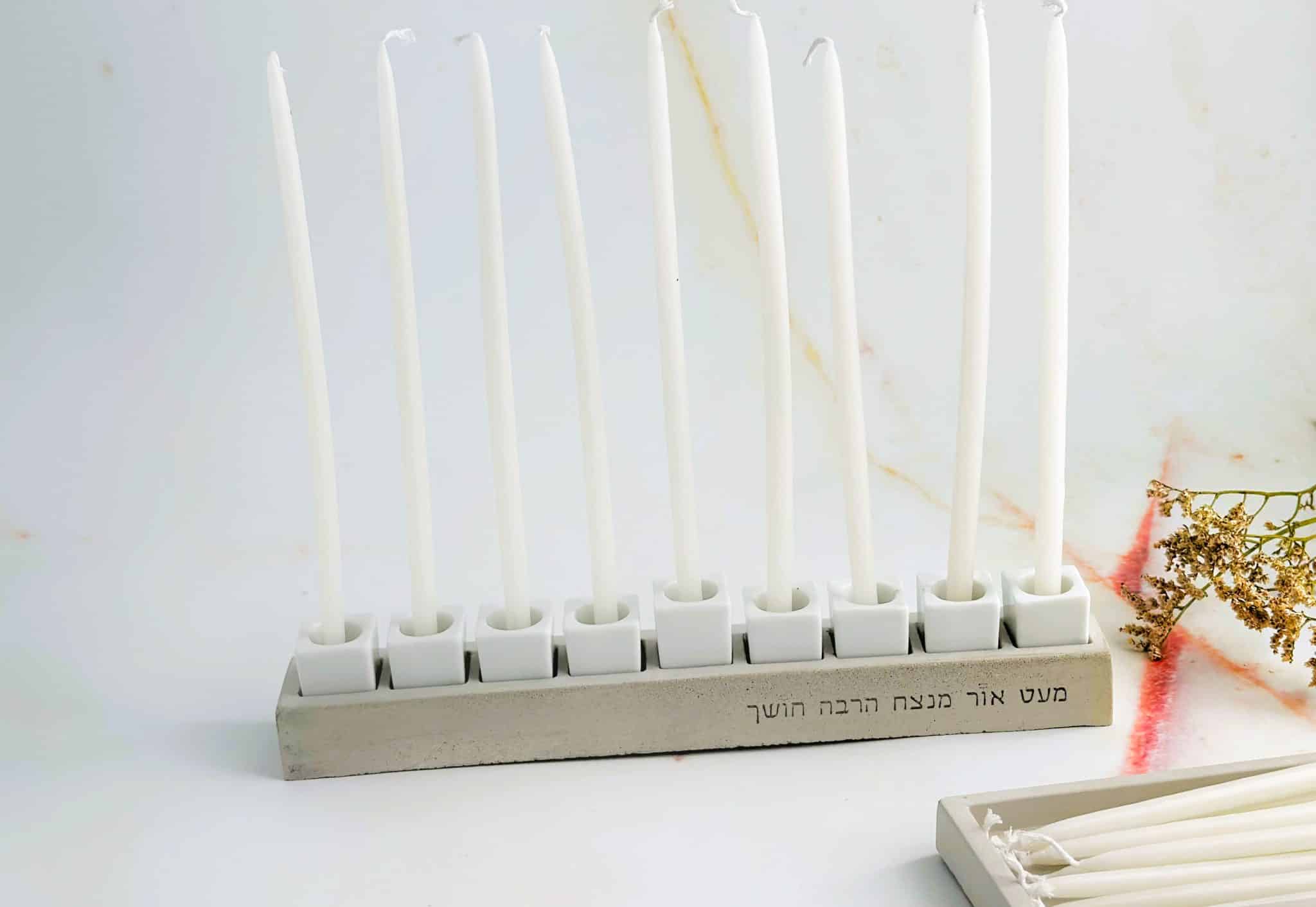 בסיס החנוכייה עשוי בטון בעיצוב נקי ומודרני בגוון הטבעי של הבטון.