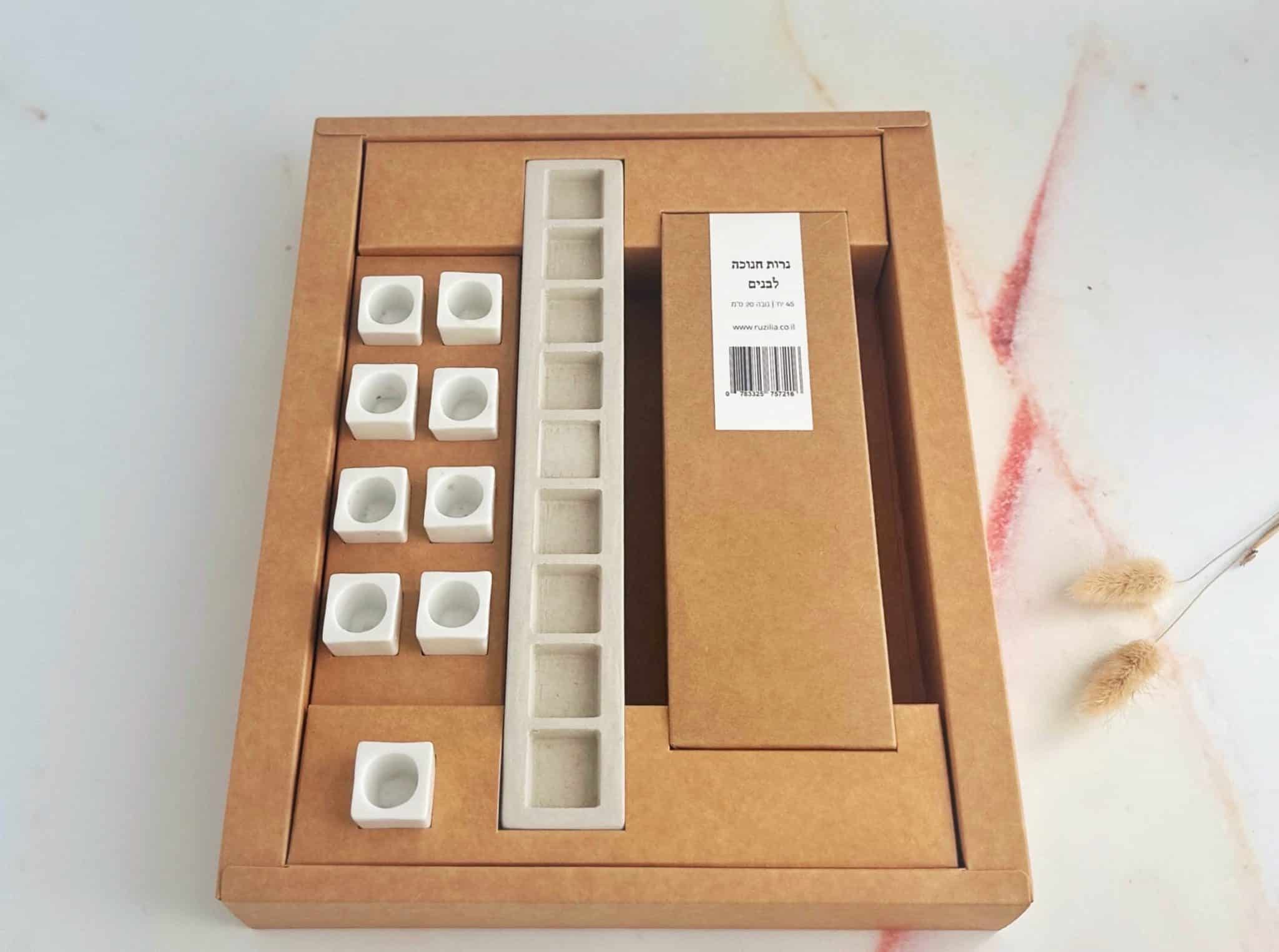 לחנוכייה קנים מפורצלן לבן, נשלפים, קלים לניקוי ומשלימים את המראה הקלאסי של החנוכיה.