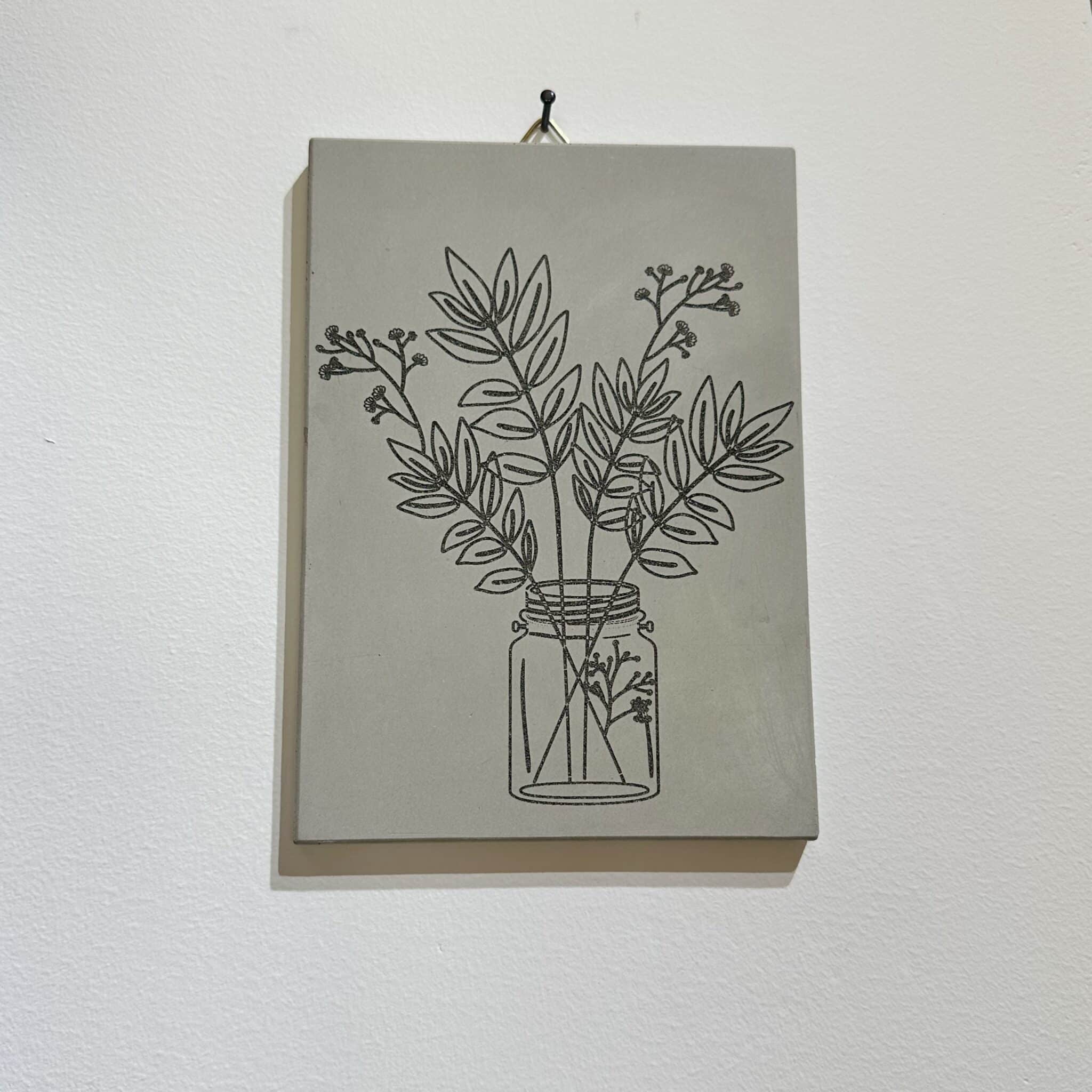 תמונת בטון בעיצוב נורדי עדין עם חריטת לייזר תמונה של פרחים בצנצנת